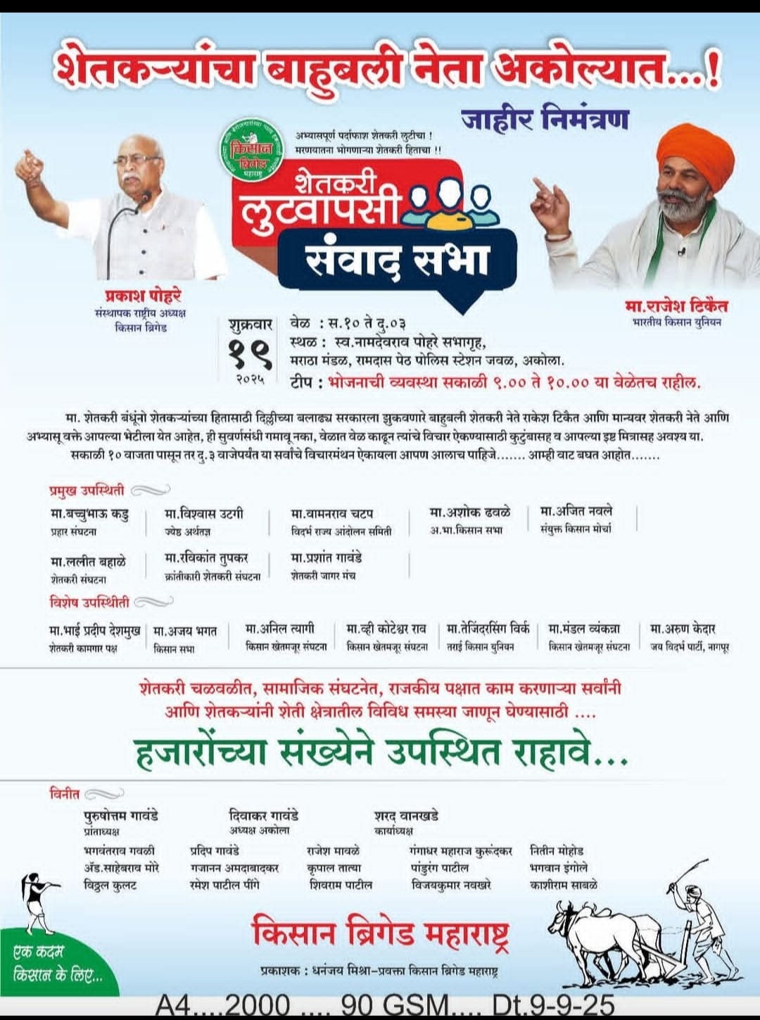 वणी (वार्ताहर):भारत krushi pradhan देश आहे शेतकरी हा देशाचा कणा आहे असुन देशातील भांडवलदार वर्ग हा अजगारा सारखा शेतकऱ्यांना गिळंकृत करु पाहत आहे शेतीला मिळणाऱ्या पिककर्जा विषयीचे बँकेचे धोरण,जाचक अटी व शर्तीच्या पायी चपला झिजत,उभा असलेला शेतकरी, कोरडवाहू जमीन,निसर्गाच्या भरोशावर शेती करु पाहणारा या देशातील शेतकरी इतका हतबल कसा,दरडोई उत्पन्न कमी,शेतकऱ्यांच्या मालाला हमीभाव नाहीत, नापिकी, कर्जबाजारी पणामुळे वाढत चाललेल्या शेतकऱ्यांच्या मुलांचे-मुलींचे शिक्षण, आरोग्य, लग्न ,या इतरही भेडसावणाऱ्या प्रश्ना ला समोर जात असताना शेतकऱ्यांची हमी न घेणारे इथले राजकीय पक्ष शेतीविषयक उद्योग क्षेत्रातील धोरण,हे बड्या उद्योग पतीला वाट मोकडी करुन देणारा केंद्रातील पक्ष हा जेव्हा हिटलरी रुप धारण करून जेव्हा शेतकऱ्यांचे दमन कारी धोरण राबवितो तेव्हा दमनकारी धोरणाला शमविणारा शेतकऱ्यांचा बाहुबली नेता मा.राजेश टिकेत “शेतकऱ्यांची लुट वापसी” संवाद सभा दिनांक १९/९/२०२५ रोज शुक्रवार अकोला येथे स्वःनामदेवराव पोहरे सभागृह वेळ सकाळी १०ते दुपारी३पर्यंत होणार असून या सभेला श्री.प्रकाश पोहरे,संस्थापक राष्ट्रीय अध्यक्ष किसान बिग्रेड,श्री.बच्चुभाऊ कडू ,प्रहार संघटना, शेतकरी चळवळीत,सामाजिक संघटनेत,राजकीय पक्षात,काम करणाऱ्या सर्वानी हजारोंच्या संख्येने उपस्थित राहावे असे आवाहन करण्यात आले आहे.