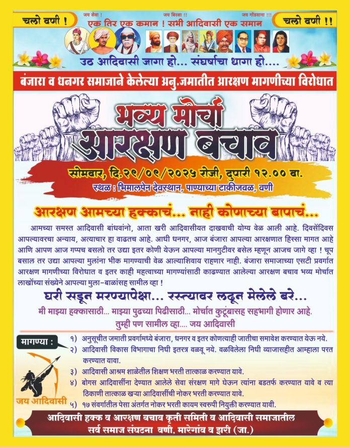 वणी:संविधानाने अनु-जाती-जमातीला त्यांच्या सर्वागीण विकासासाठी आरक्षणाची तरतूद संविधानात केली असुन आजही सर्वागाने आदिवासी समाजाचा विकास झालेला नाहीत. दैनंदिन अवनी च्या गरजा करीता आदिवासी जमात आजही गडचिरोली ते बस्तरच्या जंगलात दरी -डोंगर-कपारी तुडवीत आहे आजही यवतमाळ जिल्ह्यातील वणी पासून ओ च्या हाकेवर असलेला झरी जामणी आदिवासी बहूल एरीया बघीतला तर वा मेळघाट येथील “माना”आंध” कुमारी माता-कुपोषण-आरोग्य- बालमृत्यू-शिक्षण-बेरोजगारी-महागाई च्या काळात उत्पादनाचे एकमेव शेती साधन असलेल्या आदिवासी समाजाची जल-जमीन-जंगल शासन गिळंकृत करीत बड्या जमिनदाराला देत आहे यांचे वास्तव आपण बघत आहो अशा क्षणाला आपली सामाजिक-आर्थिक-राजकीय परीस्थिती शाबुत ठेवण्यासाठी कवच म्हणून संविधानाने आरक्षण बाहाल केले पण त्यावर इतर बंजारा-धनगर समाज आदिवासी समाजाच्या आरक्षणात मागणी करीत असुन ते घटनाद्रोही आहे. संविधानाने बंजारा-धनगर इतर समाजाला आरक्षणाची तरतुद प्रत्येकाला वेगवेगळी केली असुन आपले हक्क हे भिक मागुन मिळत नसते तर ते लढूनच मिळतात हे आजवरच्या आरक्षण बचावासाठी लढलेल्या लढाई ने दाखवून दिले आहे. तरी आज आपले आरक्षण अबाधित राहीले तर पुढच्या पिढीचे दिवस चांगले राहतील जर आज आपण घरी बसुन सडून मरण्यापेक्षा रस्त्यावर लढुन मेलेले बरे मी माझ्या हक्कासाठी माझ्या पुढच्या पिढीसाठी “आरक्षण बचाव भव्य मोर्चात दि.२९/९/२०२५ रोजी दुपारी १२.००वाजता वणी येथील भिमालपेन देवस्थान पाण्याच्या टाकीजवळ येथून भव्य मोर्चाचे आयोजन केले असुन यात वणी-झरी-मारेगाव या तालुक्यातील सर्व जनतेनी उपस्थित राहण्याचे आवाहन आदिवासी हक्क व आरक्षण बचाव क्रृती समीती व आदिवासी समाजातील सर्व संघटनांनी केली आहे.